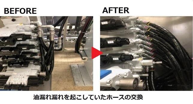 油圧ホース交換作業においてマニュホールドブロックからの油漏れを確認、予備部品と交換し対策を行った。
