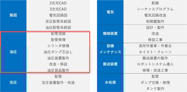 油圧だけでなく電機、機械設備、搬送関連、水処理までトータルで工場内の修理、工事も可能です。