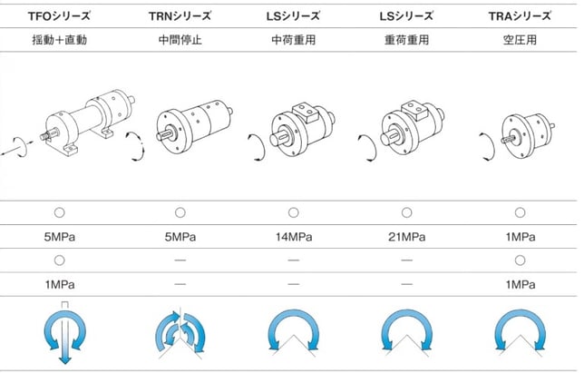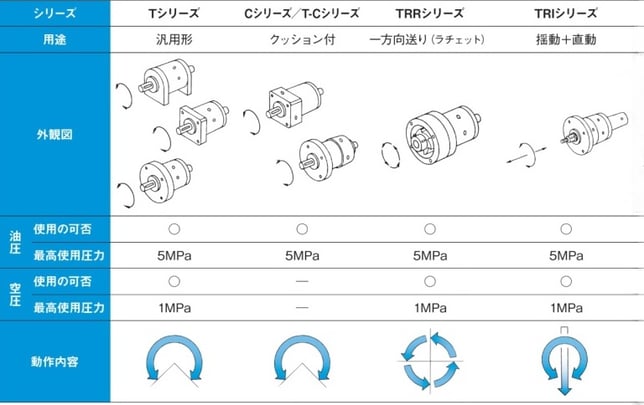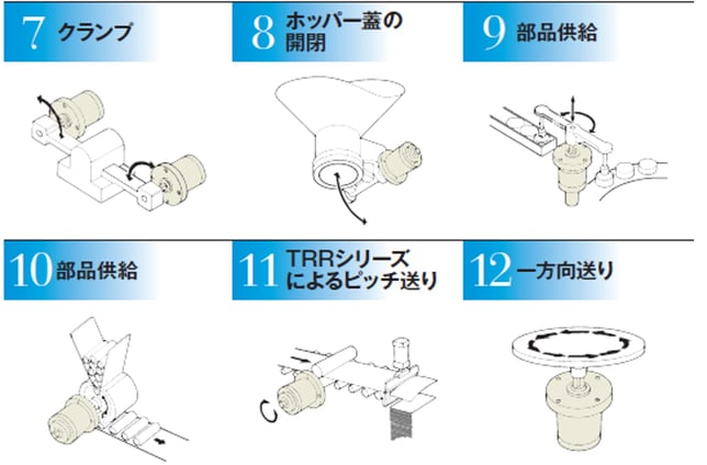 テーブル往復、90℃反転、重量物の搖動、ボールバルブの開閉、パイプベンダー、クランプ、部品供給、ピッチ送り、一方向送りなどシリーズによって多彩な動作が可能です。
