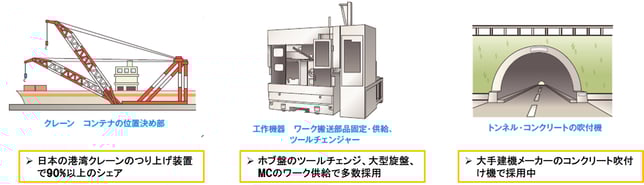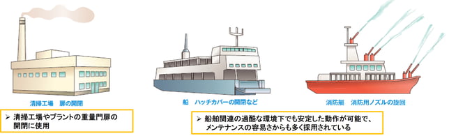 油圧の力を高効率で揺動運動に変換することができ、また、代替えの無い保持力を有しているため、スプレッター(コンテナ専用の吊り上げ装置)の多くに使用されています。